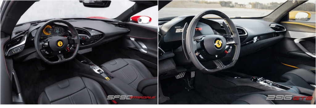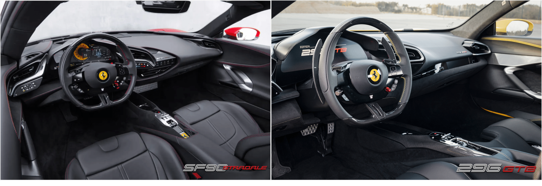 Tanto el SF90 Stradale como el 296 GTB incorporan además una segunda pantalla para el pasajero, que muestra información del vehículo, como las revoluciones del motor o la velocidad, y permite controlar funciones multimedia y de navegación básicas. La única diferencia significativa entre ambos interiores está en la ubicación de esta pantalla: en el SF90 Stradale se coloca en la parte central del salpicadero, ligeramente orientada hacia el acompañante, mientras que en el 296 GTB está situada directamente frente al pasajero. Por ello, en el SF90 el conductor puede llegar a interactuar con ella, mientras que en el 296 GTB queda reservada exclusivamente para el pasajero.