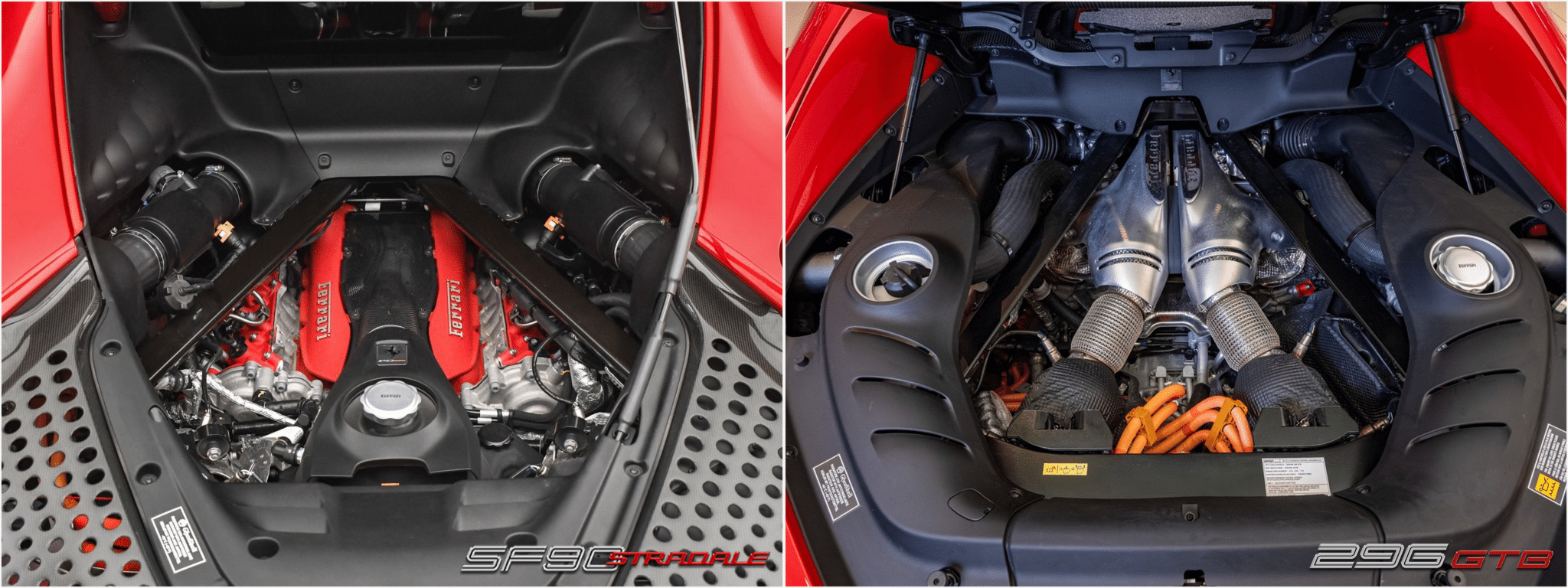 Aunque sus planteamientos mecánicos son completamente distintos, ambos modelos sí comparten algunos elementos clave. Los dos adoptan una configuración de motor central trasero, y utilizan la misma caja de cambio secuencial de doble embrague con ocho velocidades. En el caso del 296 GTB, la caja ha sido mejorada para ofrecer una respuesta más directa y rápida.